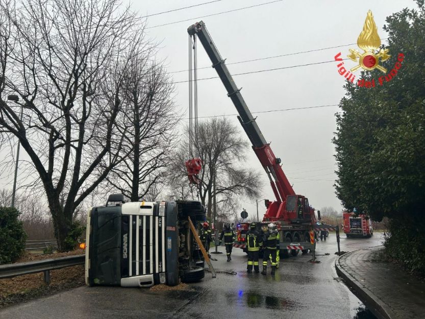 Sul posto è intervenuta l’autogru dal Comando di Milano per il recupero del camion; un’altra squadra ha tamponato una perdita di gasolio che fuoriusciva dal serbatoio del camion defluendo, a causa della pioggia, verso il centro della frazione.